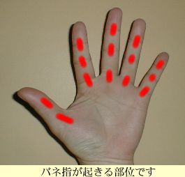 ※乳幼児の場合のバネ指は、大人の腱鞘炎によるバネ指と違って、ホルモンによるものだとされています。乳幼児のバネ指は、母指に起こるもので、“強剛母指”とも呼ばれています。しかしこの乳幼児のバネ指は大人と違って、医師の観察のもとに自然治癒してゆくケースがほとんどという事です。生後数週間から2、3才の頃に、母親が気がつくケースが多い様です。