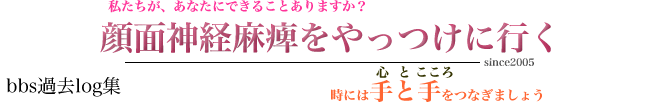 | このbbsの過去ログは、こんた治療院のコンテンツ『顔面神経麻痺を考える』に起因して書き込みがあったものです。管理人である私こと『こんた』は、顔面神経麻痺をやっつけに行く鬼軍曹として皆と一緒に顔面神経麻痺をやっつけに行くbbsであり、その軌跡を是非ともこれから顔面神経麻痺と闘う人に役立てていただく事で、私たちの思いが